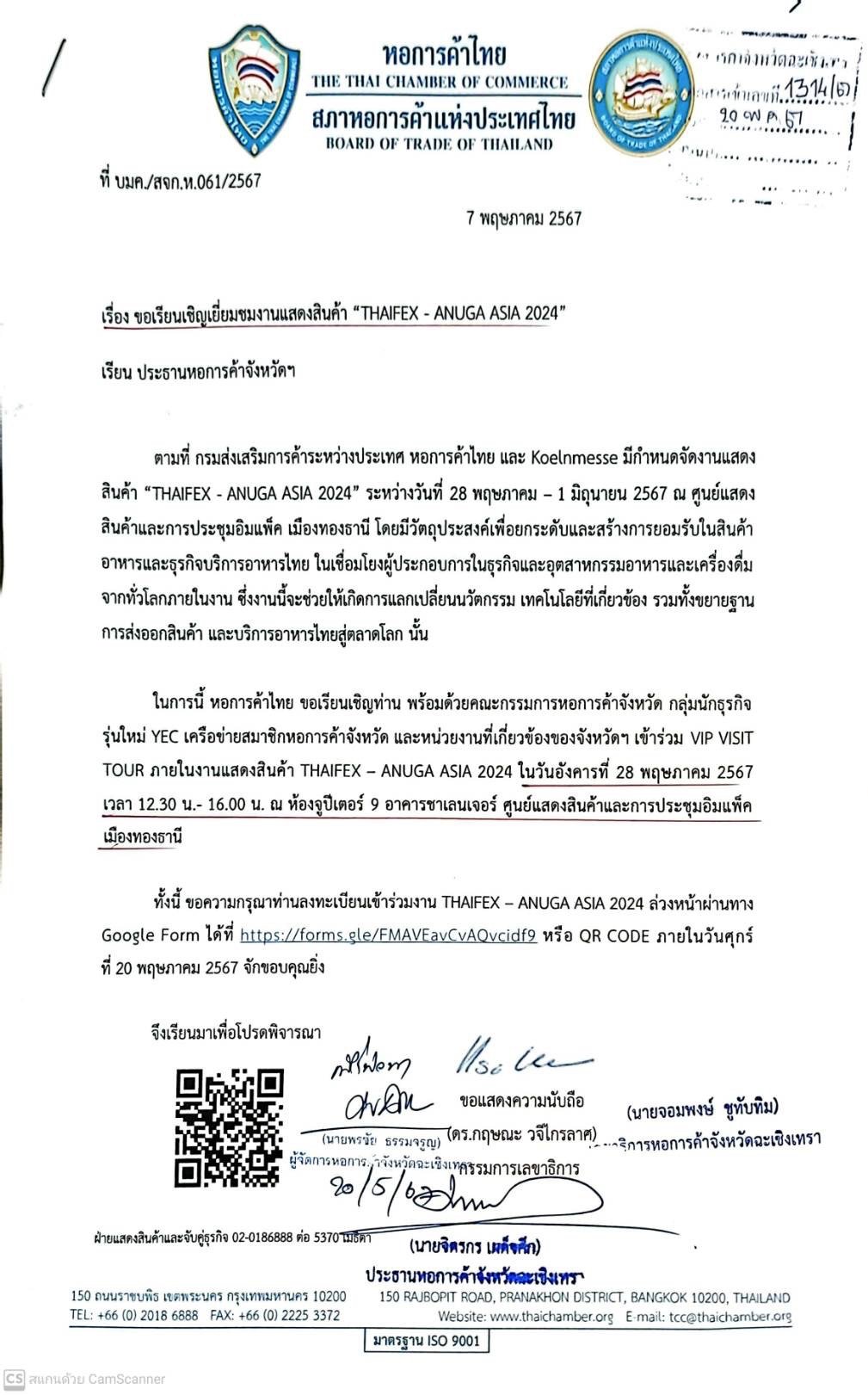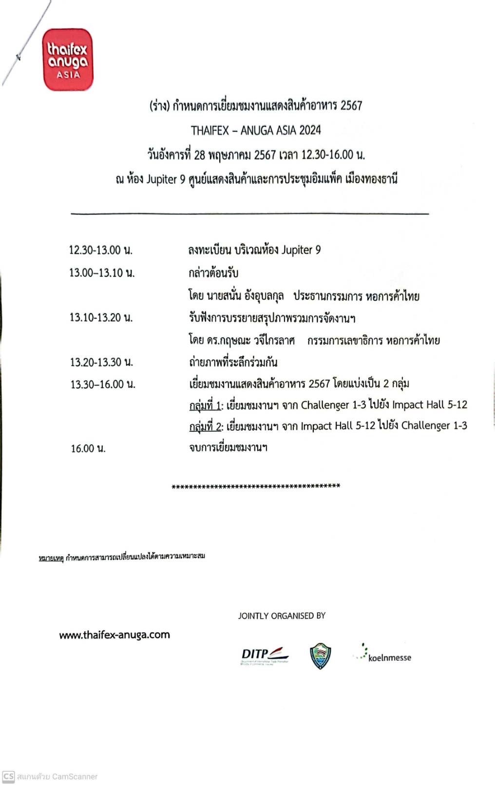 นายโชติอนันต์ ปินถานันท์ และ นางสาวปคุณา บุญก่อเกื้อ รองประธานหอการค้าฯ ร่วมงานแสดงสินค้า “THAIFEX – ANUGA ASIA 2024” ในวันอังคารที่ 28 พฤษภาคม 2567 เวลา 12.30 - 16.00 น. ณ ห้องจูปีเตอร์ 9 อาคารชาเลนเจอร์ ศูนย์การค้าและการประชุมอิมแพคเมืองทองธานี