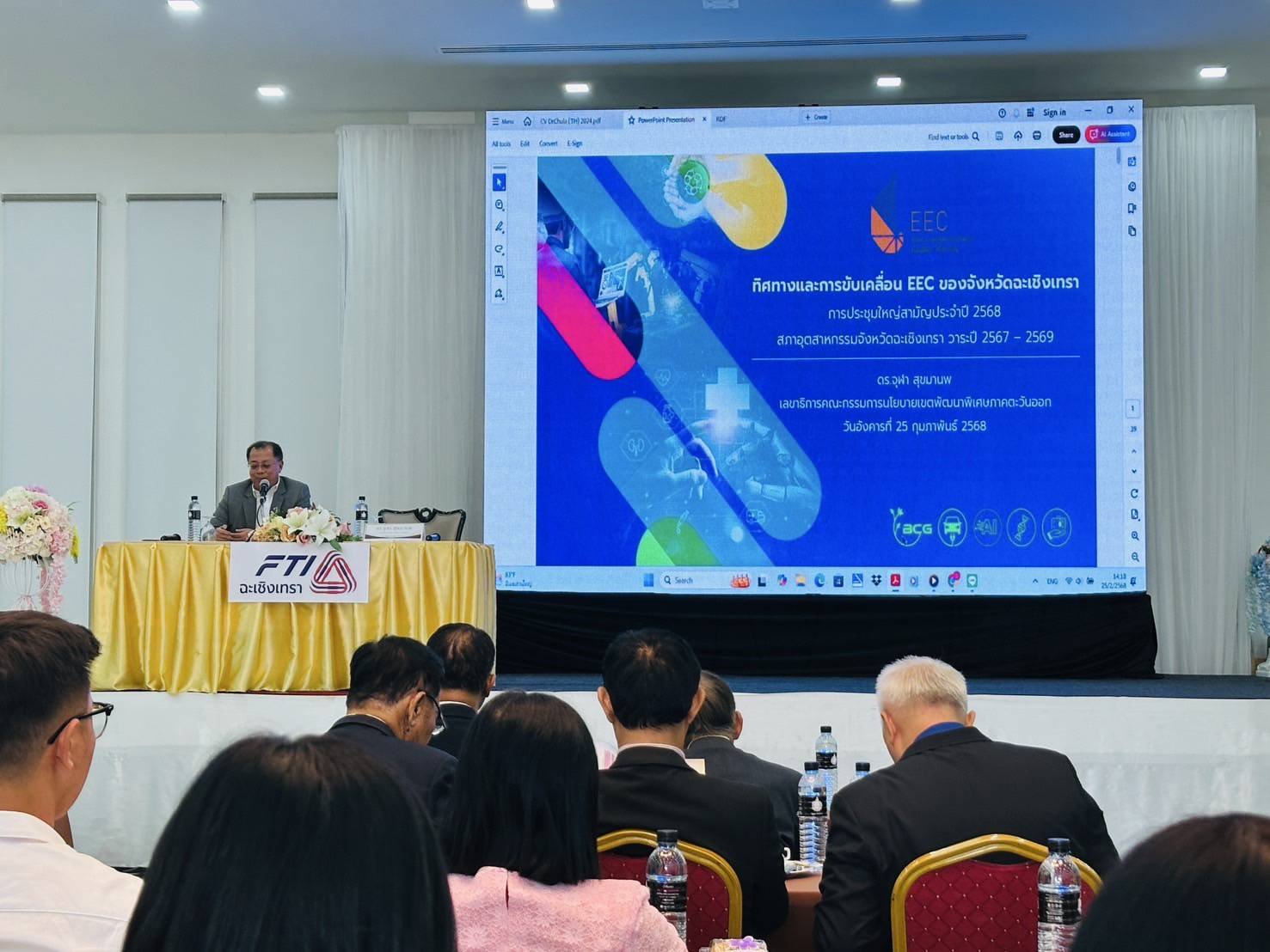 วันอังคาร 25 กุมภาพันธ์ 2568 เวลา 13.00 - 19.00 น. นายวสันต์ ศิรินภารัตน์ รองประธานหอการค้า ร่วมประชุมใหญ่สามัญประจำปี 2568 สภาอุตสาหกรรมจังหวัดฉะเชิงเทราวาระปี 2567 - 2569 และฟังบรรยายพิเศษ เรื่อง “ทิศทางและการขับเคลื่อน EEC จังหวัดฉะเชิงเทรา ณ ห้องรอยัลอินน์ โรงแรมซันธารา เวลเนส รีสอร์ท แอนด์ โฮเทล อำเภอเมือง จังหวัดฉะเชิงเทรา